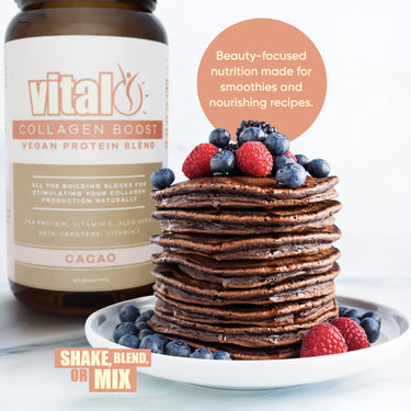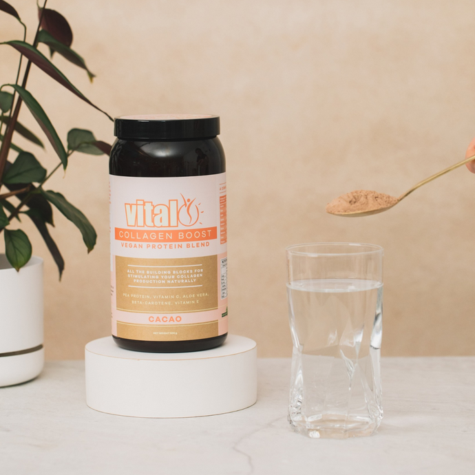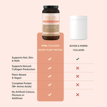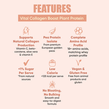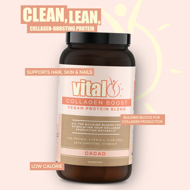The Vital Plant Protein – Collagen Boost combines the highest quality European pea protein with a premium blend of ingredients to help boost collagen production naturally. This vegan formula combines beta-carotene, vitamin c, vitamin e and aloe vera with our premium complete pea protein to support skin structure and function, and to promote natural collagen production in the body.