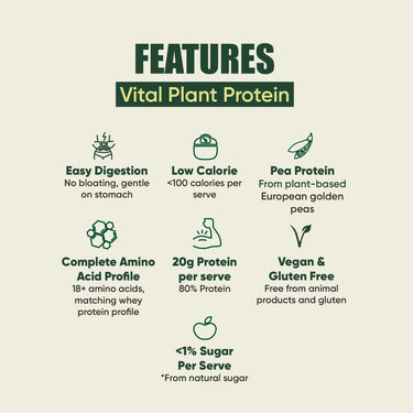 Each serving of Vital Plant Protein is 25gm. A serve delivers 20gm of protein. Select the tub size based on your daily protein needs.